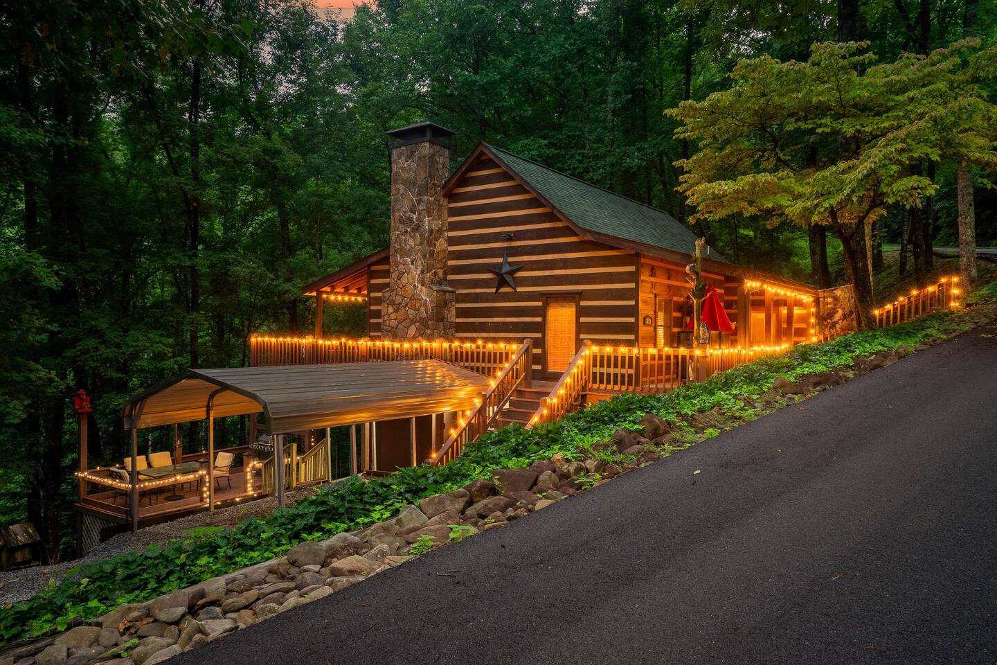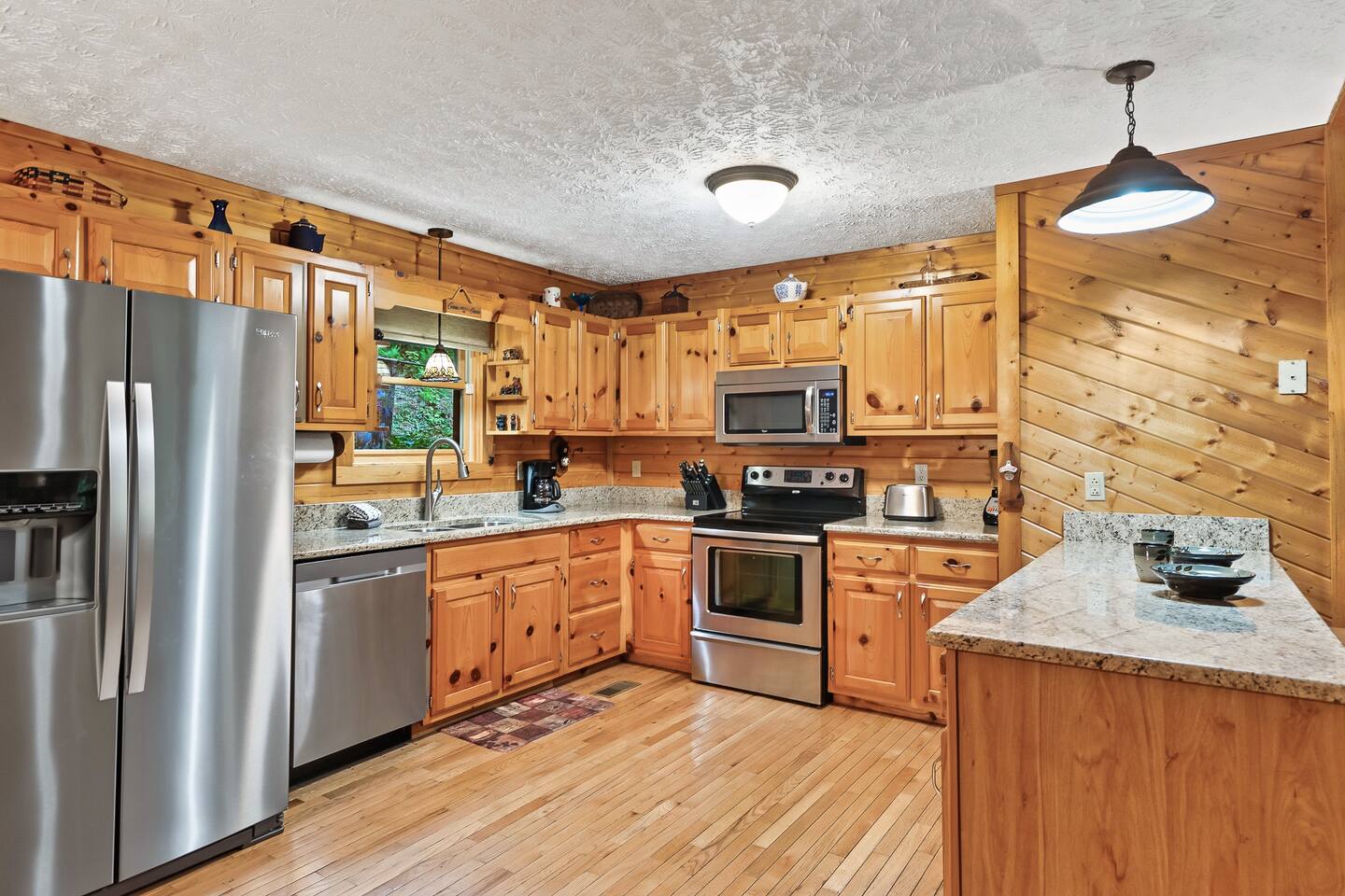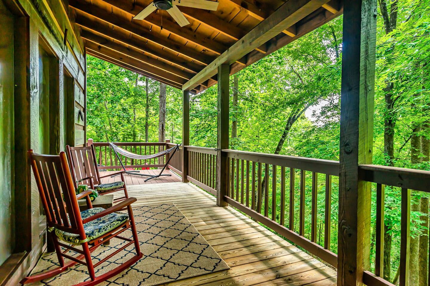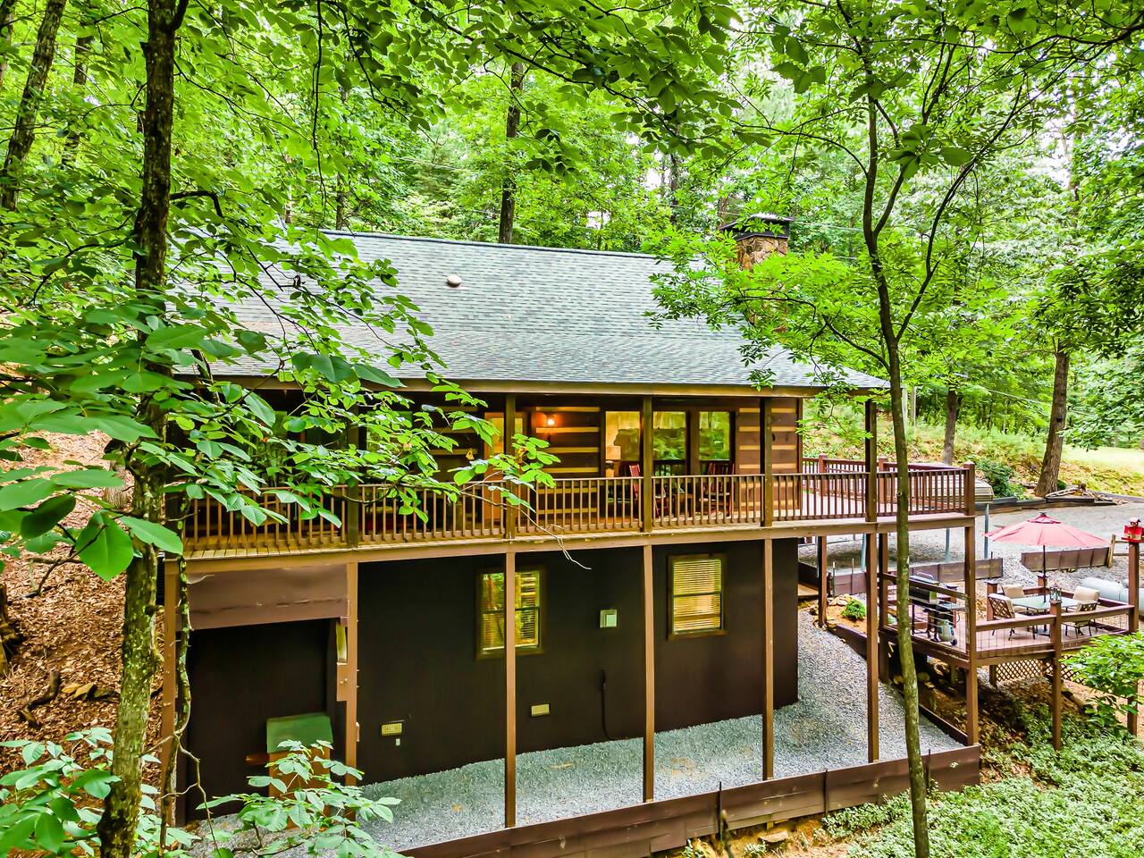 Our 3 bedroom, 3 full bath cabin with a gas fireplace, hot tub and fire pit, captures the essence of the smoky mountains. You enter by turning right at the top of the short stair case from the driveway. This will take you to the street side of the property and the main front door. Upon entering you will be in the laundry room, with washer, dryer, ironing board, etc. You will find an umbrella for your use should you need it. Straight ahead is the first full bathroom. As you exit the laundry room you will enter the full kitchen with granite counter tops and all the essential utensils and then some! There is a keurig as well as standard drip coffee pots. Plenty of space to move around and cook in the kitchen as well as a breakfast bar with seating for 4. The kitchen table seats 6 and there are two folding chairs in the laundry room for larger families. Turn right from the kitchen and you will be in the master suite with attached full bath. This room has a large king sized bed (seriously, it's huge!). The closet has a pack n play for kids. This room has a door out to the deck for easy access to the hot tub. When you exit the room back into the cabin, you will be in the large family room with huge smart TV, pull out couch, and large stone floor to ceiling fireplace with gas logs. The pull out is a queen and the sheets are in the dresser of the guest room that is our next stop. This room is right off the family room and has a queen sized bed, smart TV and closet. Through the family room you will find a door leading out to the back deck and the hot tub. Towels are right inside that door for your use. The spiral staircase down takes you to a 3rd bedroom/game room with multiple arcade games, an electric fireplace, foosball table and large smart TV. Here you will find a queen over queen bunk bed and futon to sleep up to 5 additional guests. This floor also has a full bath. There is a door leading back out to the carport and if you make a right from there you will find a serene fire pit and ample seating for the family. We know you will love this cabin as much as we do. It is in the perfect location on the quiet side of the smoky mountains, yet convenient to everywhere. Thank you for considering our place for your next adventure!
