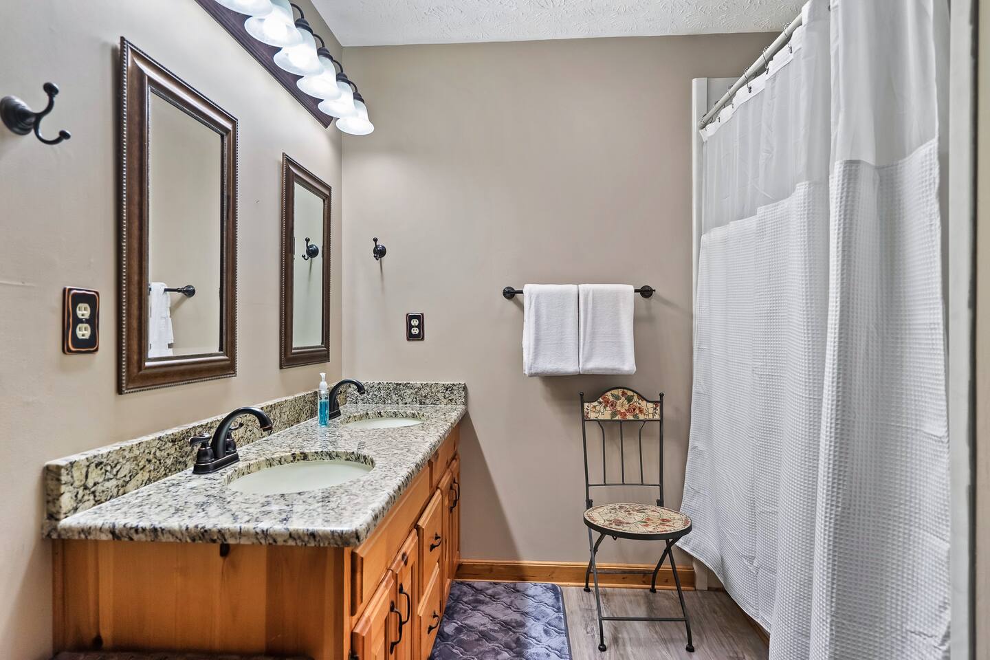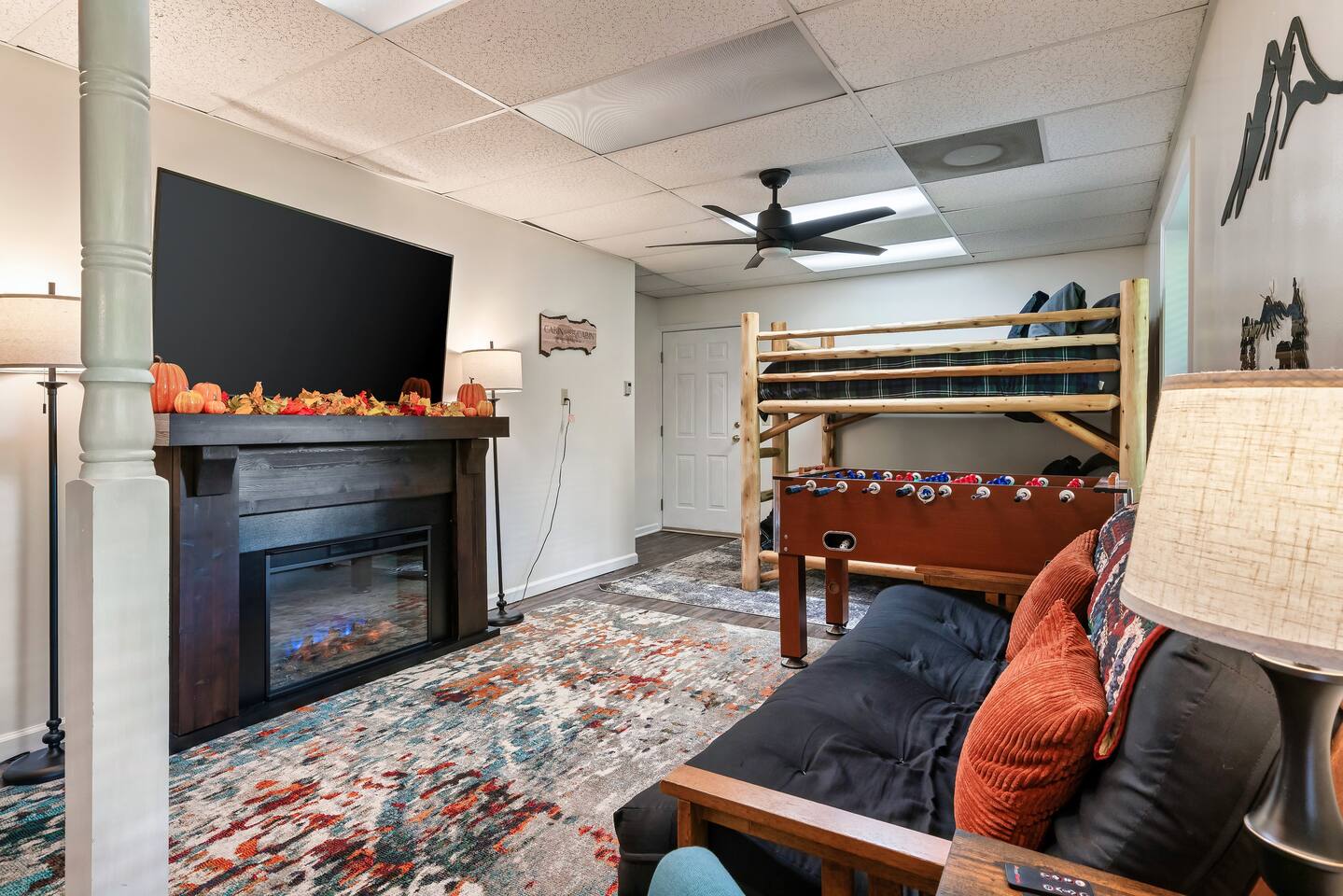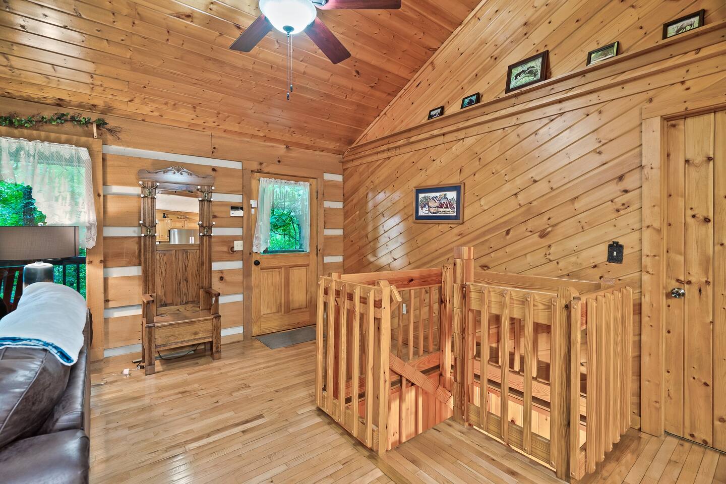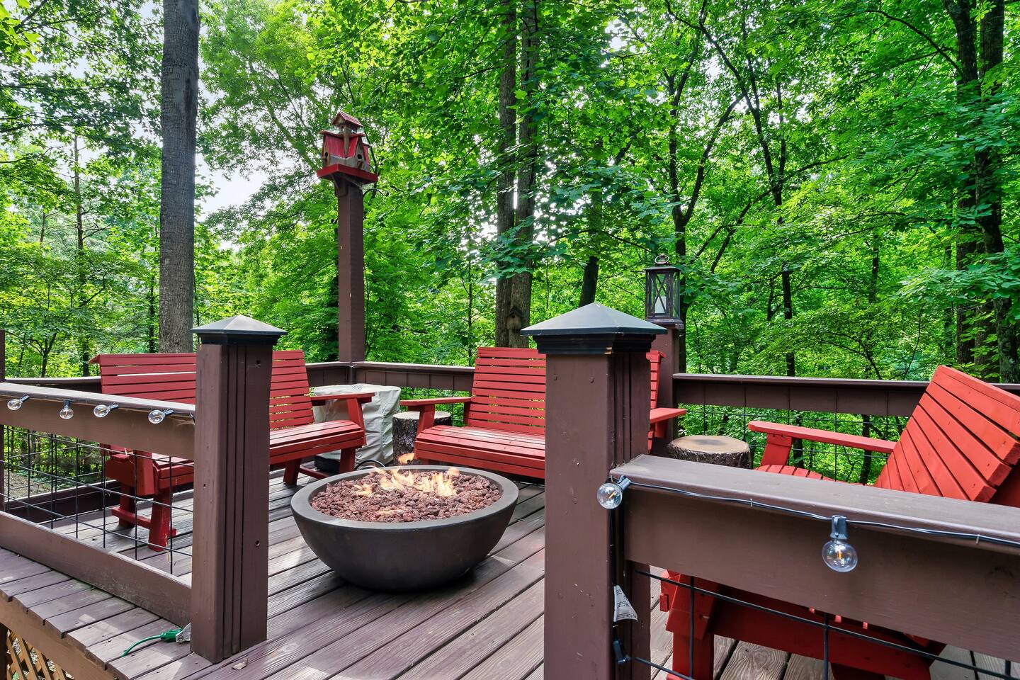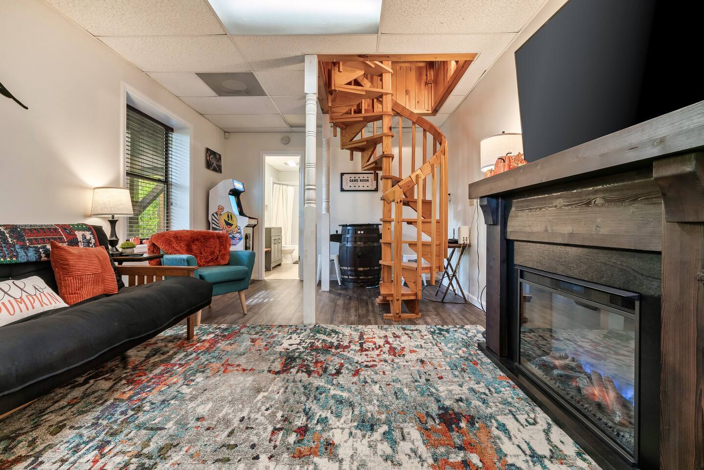 Our 3 bedroom, 3 full bath cabin with a gas fireplace, hot tub and fire pit, captures the essence of the smoky mountains. You enter by turning right at the top of the short stair case from the driveway. This will take you to the street side of the property and the main front door. Upon entering you will be in the laundry room, with washer, dryer, ironing board, etc. You will find an umbrella for your use should you need it. Straight ahead is the first full bathroom. As you exit the laundry room you will enter the full kitchen with granite counter tops and all the essential utensils and then some! There is a keurig as well as standard drip coffee pots. Plenty of space to move around and cook in the kitchen as well as a breakfast bar with seating for 4. The kitchen table seats 6 and there are two folding chairs in the laundry room for larger families. Turn right from the kitchen and you will be in the master suite with attached full bath. This room has a large king sized bed (seriously, it's huge!). The closet has a pack n play for kids. This room has a door out to the deck for easy access to the hot tub. When you exit the room back into the cabin, you will be in the large family room with huge smart TV, pull out couch, and large stone floor to ceiling fireplace with gas logs. The pull out is a queen and the sheets are in the dresser of the guest room that is our next stop. This room is right off the family room and has a queen sized bed, smart TV and closet. Through the family room you will find a door leading out to the back deck and the hot tub. Towels are right inside that door for your use. The spiral staircase down takes you to a 3rd bedroom/game room with multiple arcade games, an electric fireplace, foosball table and large smart TV. Here you will find a queen over queen bunk bed and futon to sleep up to 5 additional guests. This floor also has a full bath. There is a door leading back out to the carport and if you make a right from there you will find a serene fire pit and ample seating for the family. We know you will love this cabin as much as we do. It is in the perfect location on the quiet side of the smoky mountains, yet convenient to everywhere. Thank you for considering our place for your next adventure!